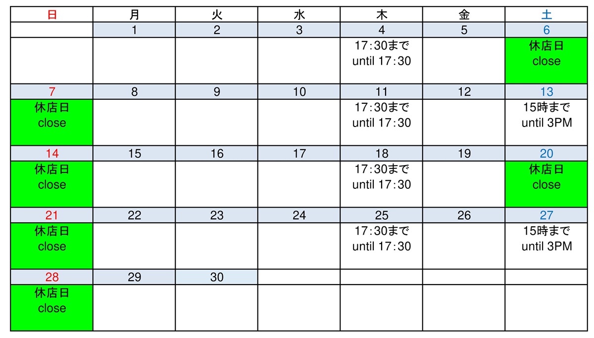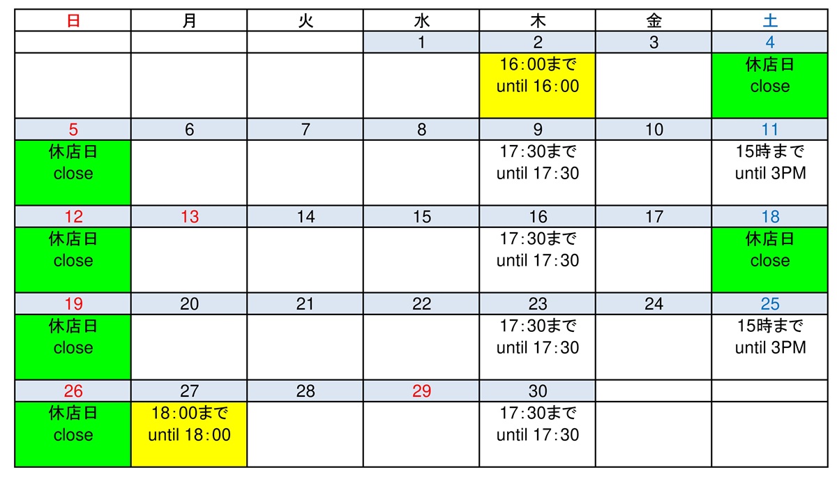 ゴールデンウィーク中,5月2日(土)~4日(月)を休店日とさせていただきます。