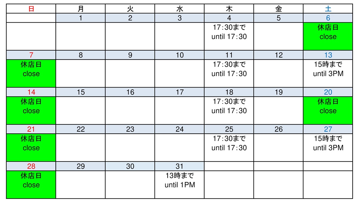 大変申し訳ありません。誠に勝手ながら都合により,以下の予定での営業となります。